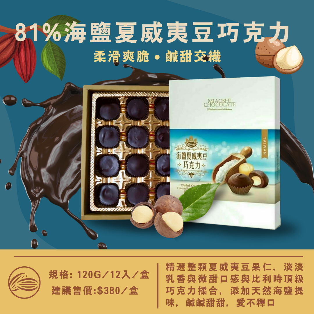 精選大顆夏威夷豆果仁,帶著淡淡的微甜乳香與苦甜巧克力交織成美妙協奏曲,灑上些許海鹽調味更絕配。