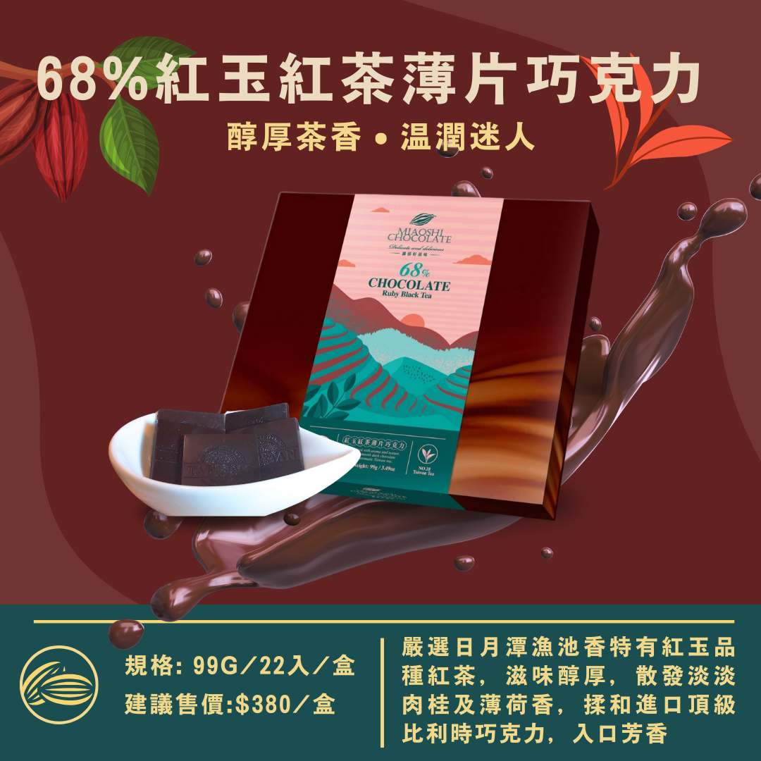 嚴選產自日月潭漁池茗品:紅玉紅茶,滋味醇厚,帶有淡淡肉桂及薄荷芬芳,入喉甘甜回韻,佐以比利時頂級巧克力,享受最高級的味蕾饗宴。