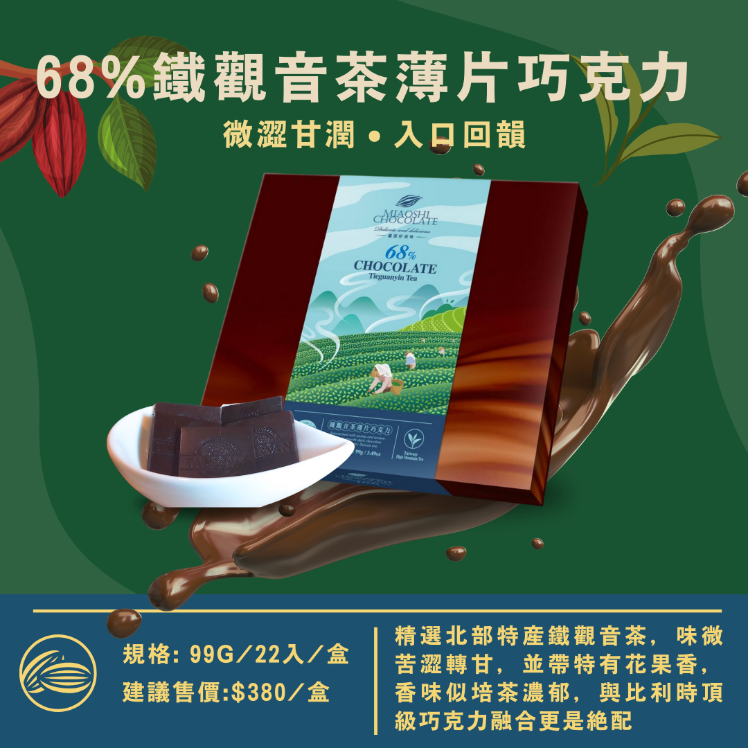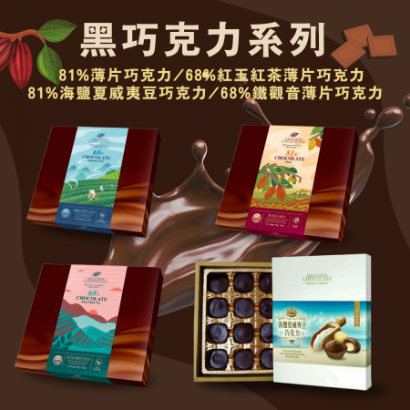 81%海鹽夏威夷豆巧克力 120g/盒(全素) 68%紅玉紅茶薄片巧克力 99g/盒(奶素) 68%鐵觀音薄片巧克力 99g/盒(奶素) |